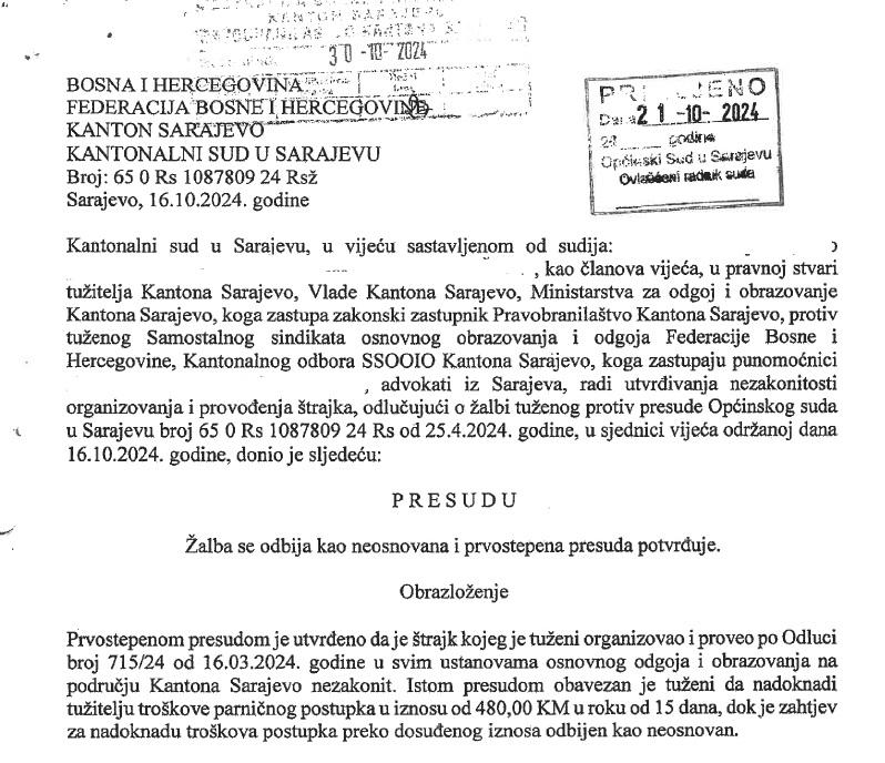 Podsjećamo, Kantonalni sud u Sarajevu je 16. oktobra 2024. godine donio pravosnažnu presudu da je štrajk upozorenja koji je organizovao Samostalni sindikat osnovnog obrazovanja i odgoja Federacije Bosne i Hercegovine - Kantonalni odbor SSOOIO Kantona Sarajevo bio nezakonit.