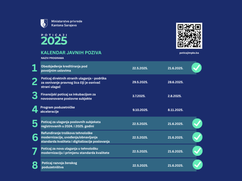 Ministarstvo privrede Kantona Sarajevo objavilo je prvih pet javnih poziva usmjerenih na jačanje poduzetništva i unapređenje poslovanja za 2025. godinu. Ovi programi predstavljaju značajan korak ka jačanju konkurentnosti domaćih preduzeća, razvoju inovacija i stvaranju novih radnih mjesta.