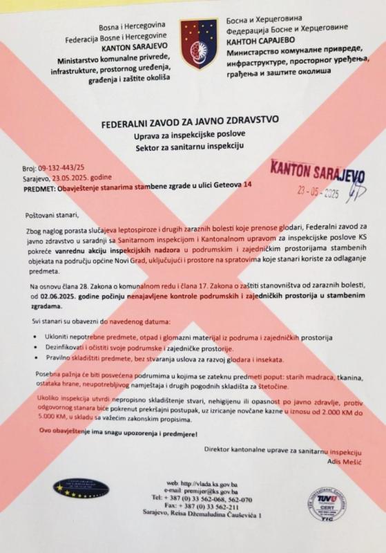 Vlada Kantona Sarajevo, Ministarstvo komunalne privrede, infrastrukture, prostornog uređenja, građenja i zaštite okoliša i Kantonalna uprava za inspekcijske poslove KS upoznati su da je u pojedinim ulazima zgrada na Alipašinom Polju postavljen dopis broj:09-132-443/25 od 23.05.2025. godine, koji sadrži nazive i oznake Ministarstva komunalne privrede KS i Federalnog zavoda za javno zdravstvo, dok su u fusnoti dokumenta navedeni kontakt podaci Kabineta premijera KS, a isti je potpisan od strane Adisa Mešića, u svojstvu "direktora kantonalne uprave za sanitarnu inspekciju". Navedenim aktom, u čijem smo posjedu, najavljena je vanredna akcija inspekcijskih nadzora u podrumskim i zajedničkim prostorijama stambenih objekata na području općine Novi Grad Sarajevo, a zbog aktuelne epidemije leptospiroze, te novčano sankcionisanje stanara koji ne izvrše pravovremeno čišćenje i dezinfekciju podrumskih i zajedničkih prostorija zgrade.